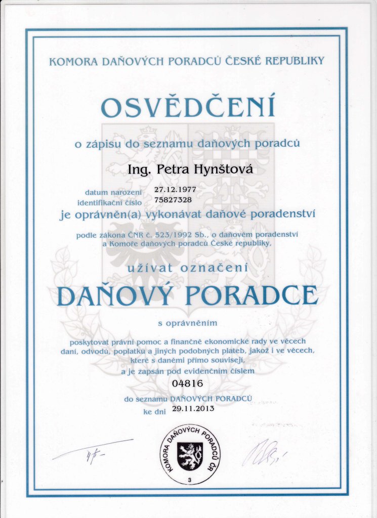 V roce 2013 jsem se stala daňovým poradcem. To mi umožňuje poskytovat komplexní služby nejen v oblasti účetnictví, ale i v oblasti daní.
